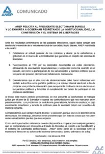 ANEP FELICITA AL PRESIDENTE ELECTO NAYIB BUKELE Y LO EXHORTA A GOBERNAR RESPETANDO LA INSTITUCIONALIDAD, LA CONSTITUCIÓN Y EL SISTEMA DE LIBERTADES